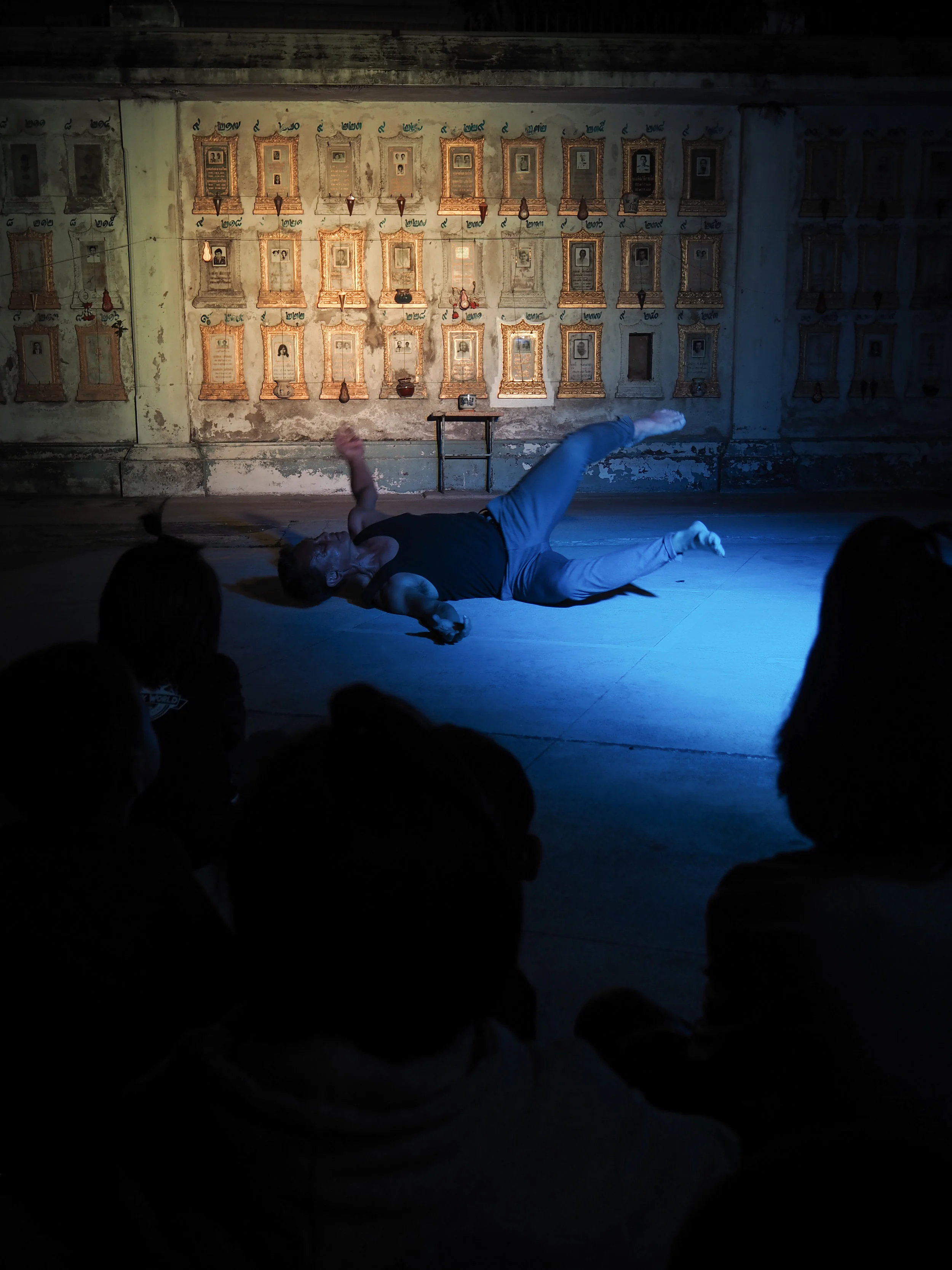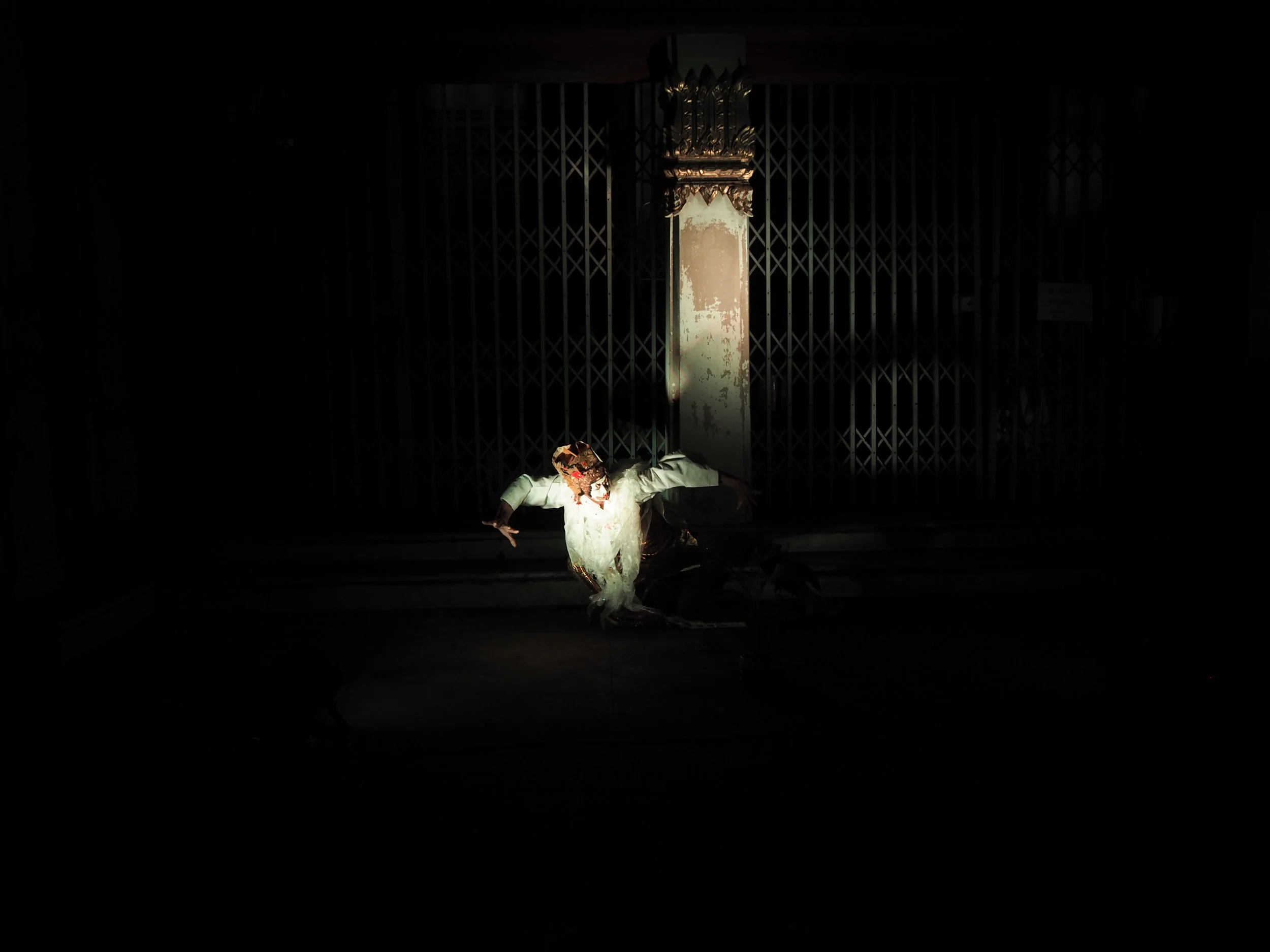 Each performer chose a spot around the temple that resonated with him the most. Takashi and Tony chose to work with the columbarium wall, a wall storing the cinerary urns, while Agung chose the space between the columbarium and the main temple. The location of the performances impressed the community, as it indicated that the dancers were not afraid of ghosts. Takashi, in particular, chose a narrow space near the columbarium that ends in a dark corner, from where he emerged pulled on a cart by Benjamin. This was a great opportunity to transform the perception of the space, from something to be feared into something to be enjoyed.“This is one of the levels on which they connected with the performance, as it was accessing their beliefs about that area, and inviting them to live this space in a new way”, explains Ploy.