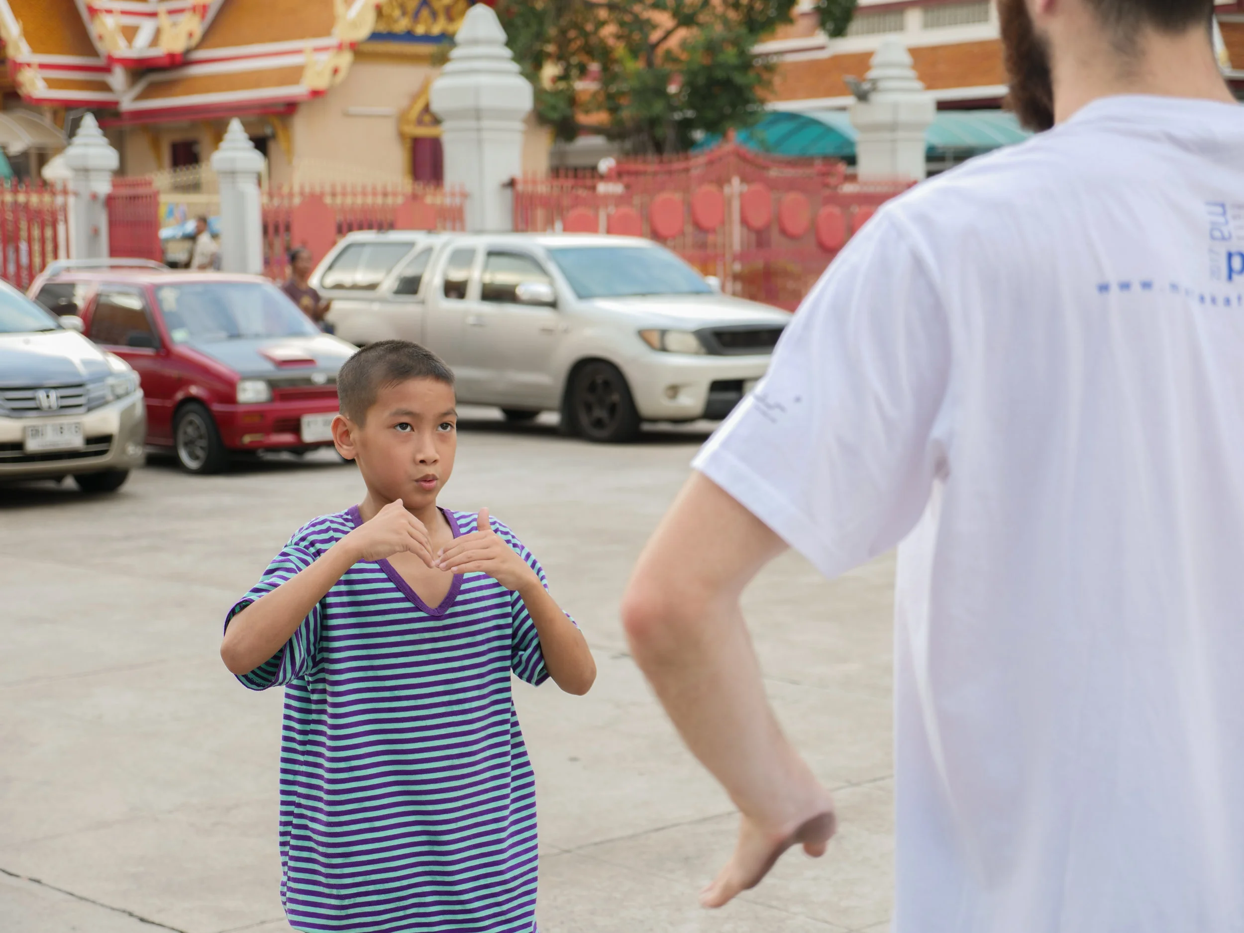 The project comprised two distinct parts: a performance by four of the artists, and two workshops—one run by Mike and Benjamin, and one run by Tony. 15 to 20 people participated in each workshop, some of whom were community members, while the performances drew a big crowd from within the community, as well as a few visitors. The performances took place at the Wat Care Nang Lerng temple, both because of its spacious grounds and central location, and for its significance for the local people.