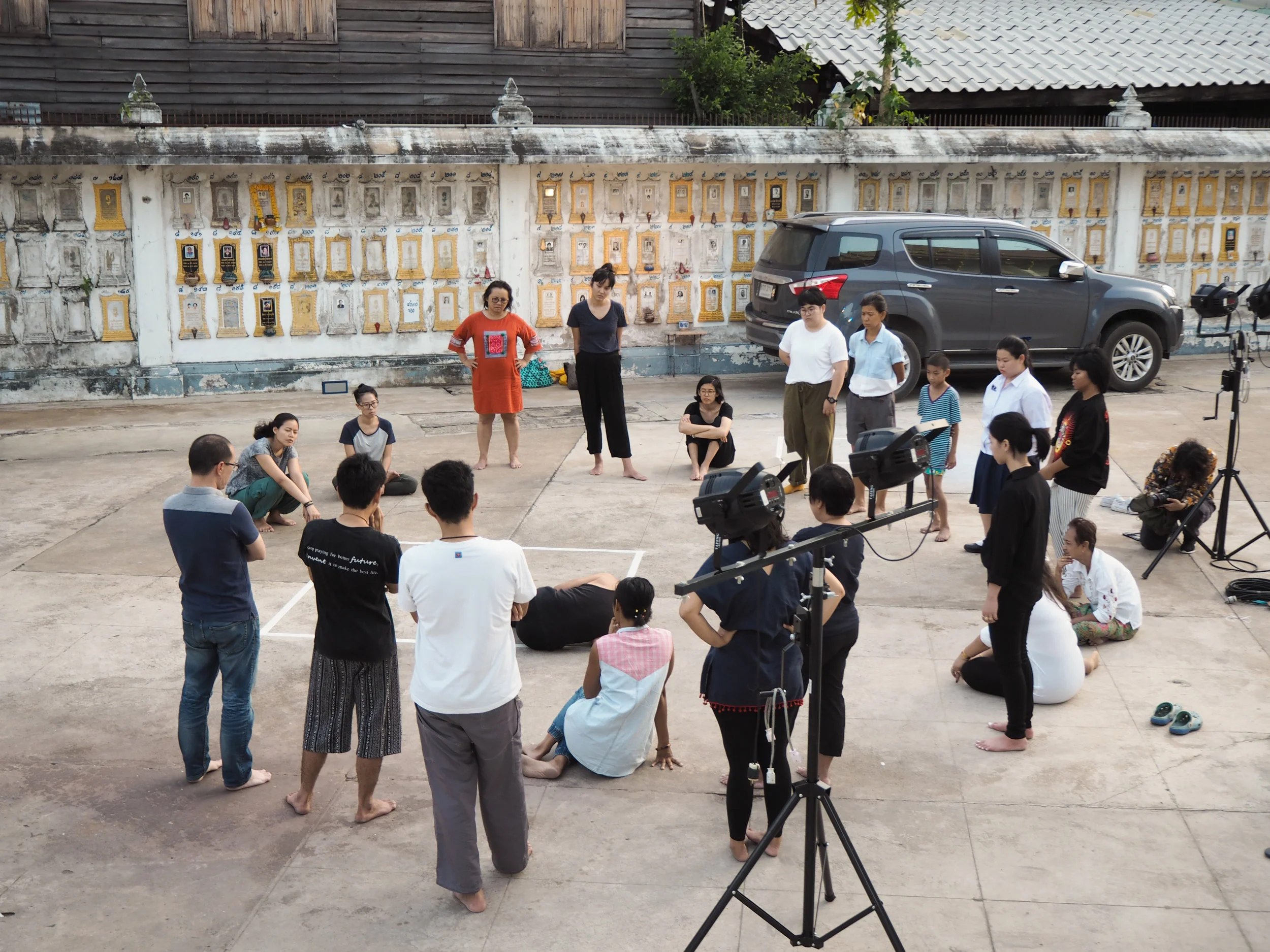 Nang Lerng is an interesting stage for embodied movement, as it offers a beautiful built environment and strong relations with the community and its leaders, as well as an existing art tradition. The E-Lerng collective practices, performs and teaches the traditional Thai Chatri dance and play, continuously promoting their local culture. The collaboration with these five artists is interesting in the sense that it is introducing some new art forms to the community, giving them a new canvas to experiment with.