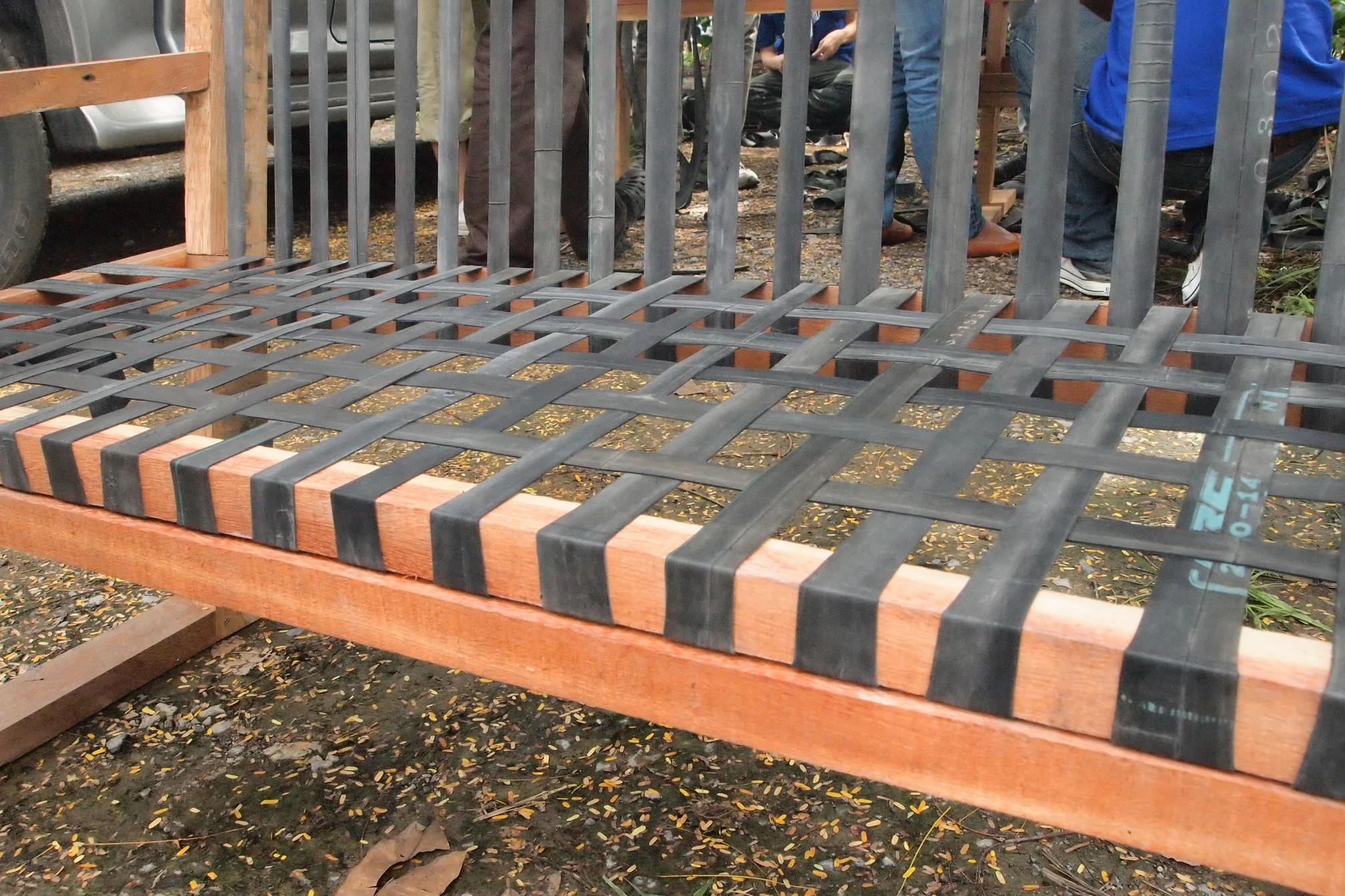 We used locally sourced materials, thus allowing the community members to build the furniture themselves, which would permit them to repair them by themselves at minimal cost. We used local bamboo, wood from run down houses and the inside rubber from motorcycle tyres, as everyone in this community rides a motorbike. The elderly people built the entire community so there is a tradition of builders.